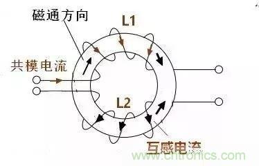 1)L1的磁通會使L2產生互感電動勢,互感電動勢的方向總是要阻礙磁通的增加,于是在L2中產生和共模電流方向相反的電流,L2的共模電流被抵消,反之,L1對L2的互感電流也是與L1的共模電流方向相反,也就是說L1的共模電流被抵消。如下圖所示,L2中的互感電流與L2的共模電流方向相反的: