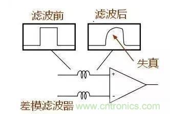 共模濾波器和差模濾波器對差模信號濾波效果對比,差模濾波器在濾出疊加在信號上的噪聲后導致波形失真。