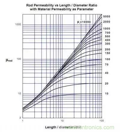 圖中橫坐標是磁棒的長度與直徑之比,隨長度變短氣隙變小等效磁導率也變小,這好像不合理,我們看磁環的電感計算公式: