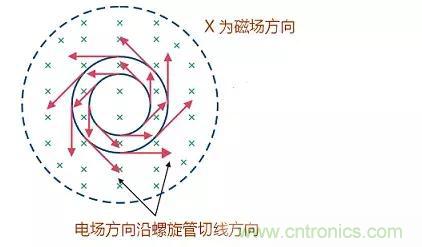 如圖是螺旋線圈中磁場和電場的關系示意圖,電場方向是沿線圈圓周的切線方向,而磁場在圖中是垂直穿過。