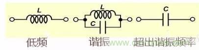 電感線圈在低頻、諧振及工作頻率高于諧振頻率時會呈現不同的特性,特別是當工作頻率超過諧振頻率是電感不再是電感而變成的電容。圖中的電容是線圈的匝間電容。