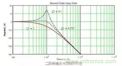 有于濾波電路中有兩個儲能原件因此是兩階濾波器,這濾波器有個很大的問題,由于無阻尼,因此當干擾信號的頻率達到濾波器的截止頻率時(Cut off),干擾信號不但沒有被抑制反而被放大了,如圖所示:
