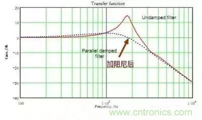 可以看出,截止頻率處的尖峰被壓平,也就是說不再使得噪聲被放大。其中電容 Cd 對阻尼不起作用,只是為了隔離輸入電壓以避免電阻產生