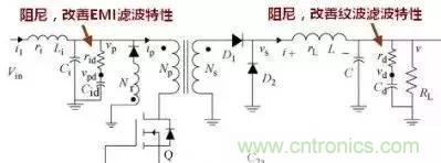 這是一個正激電源,請特別注意,輸入LC的EMI濾波器和輸出的紋波濾波器都有一個電容串聯電阻的阻尼電路,阻尼作用前面已多次提及。特別注意輸出端的阻尼電路,曾經見過帖子問為何在電解電容上串聯一個電阻,但似乎都沒有人知道為什么,請記住這是為了改善紋波性能加上的阻尼電路,有了這個阻尼電路課大大改善紋波性能。道理同EMI濾波器的阻尼相同。