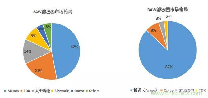 從全球范圍來看,SAW濾波器的主要供應(yīng)商包括TDK-EPCOS、Murata(村田)和太陽誘電,三者合計(jì)占據(jù)了全球82%的市場(chǎng)份額。BAW濾波器的主要供應(yīng)商包括Avago及Qorvo(Triquint),兩者占據(jù)了全球95%以上的市場(chǎng)份額。