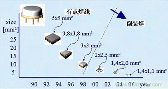 2)改進(jìn)器件的封裝形式,現(xiàn)在已經(jīng)由傳統(tǒng)的圓形金屬殼封裝改為方形或長(zhǎng)方形扁平金屬封裝或LCCC(無引線陶瓷芯片載體)表面貼裝的形式,采用體積更小的CSP封裝形式,目前封裝尺寸已做到1.1mm x 0.9mm;