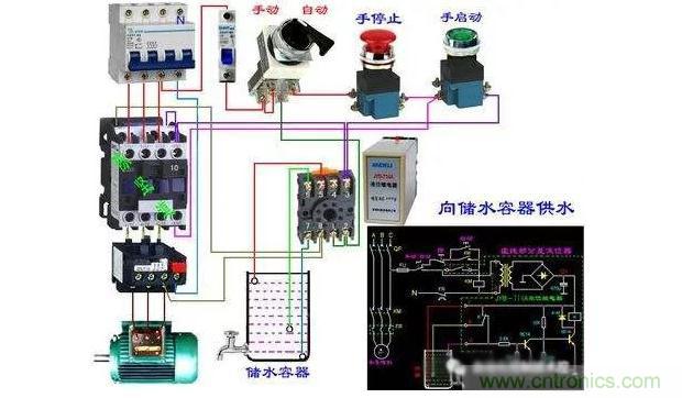 自動控制由傳感器和控制執行機構組成。液位控制器的傳感器一般是導線。利用水的導電性。水的導電性較差,不能直接驅動繼電器。所以要有電子線路將電流放大,以推動繼電器工作。繼電器就是執行機構。