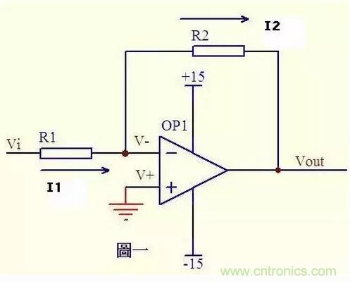 圖一運放的同向端接地=0V,反向端和同向端虛短,所以也是0V,反向輸入端輸入電阻很高,虛斷,幾乎沒有電流注入和流出,那么R1和R2相當于是串聯(lián)的,流過一個串聯(lián)電路中的每一只組件的電流是相同的,即流過R1的電流和流過R2的電流是相同的。 流過R1的電流I1 = (Vi - V-)/R1 ……a 流過R2的電流I2 = (V- - Vout)/R2 ……b V- = V+ = 0 ……c I1 = I2 ……d 求解上面的初中代數(shù)方程得Vout = (-R2/R1)*Vi 這就是傳說中的反向放大器的輸入輸出關(guān)系式了。
