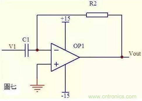 圖七中由虛斷知,通過電容C1和電阻R2的電流是相等的,由虛短知,運放同向端與反向端電壓是相等的。則: Vout = -i * R2 = -(R2*C1)dV1/dt 這是一個微分電路。如果V1是一個突然加入的直流電壓,則輸出Vout對應(yīng)一個方向與V1相反的脈沖。