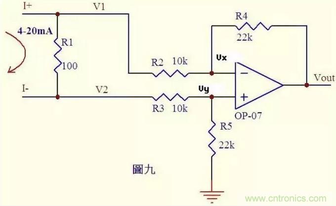 分析一個大家接觸得較多的電路。很多控制器接受來自各種檢測儀表的0~20mA或4~20mA電流,電路將此電流轉(zhuǎn)換成電壓后再送ADC轉(zhuǎn)換成數(shù)字信號,圖九就是這樣一個典型電路。如圖4~20mA電流流過采樣100Ω電阻R1,在R1上會產(chǎn)生0.4~2V的電壓差。由虛斷知,運放輸入端沒有電流流過,則流過R3和R5的電流相等,流過R2和R4的電流相等。 故: (V2-Vy)/R3 = Vy/R5 ……a (V1-Vx)/R2 = (Vx-Vout)/R4 ……b 由虛短知: Vx = Vy ……c 電流從0~20mA變化,則V1 = V2 + (0.4~2) ……d 由cd式代入b式得(V2 + (0.4~2)-Vy)/R2 = (Vy-Vout)/R4 ……e 如果R3=R2,R4=R5,則由e-a得Vout = -(0.4~2)R4/R2 ……f 圖九中R4/R2=22k/10k=2.2,則f式Vout = -(0.88~4.4)V,即是說,將4~20mA電流轉(zhuǎn)換成了-0.88 ~ -4.4V電壓,此電壓可以送ADC去處理。