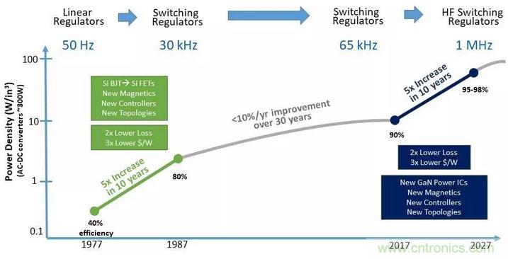 功率密度(AC-DC轉換器~300W);線性調節器;開關調節器;高頻開關調節器;新磁性元件;新控制器;新拓撲結構;2倍低損耗;3倍低成本/W;10年5倍提升;超過30年每年<10%改善;十年5倍提升;新GaN功率IC;效率。