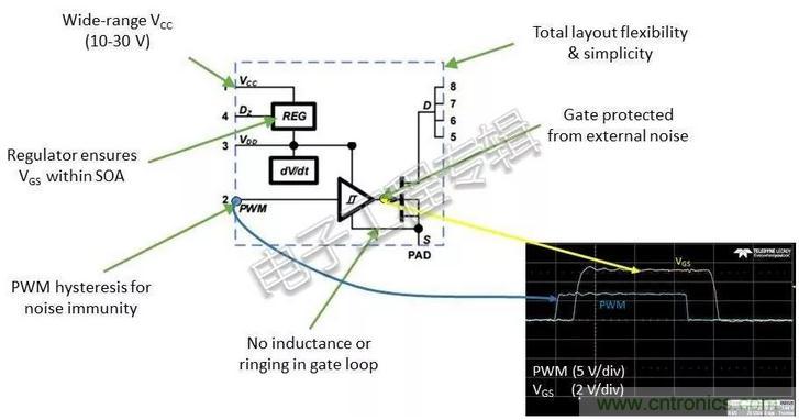 寬范圍Vcc;調節器可保護SOA內的VGS;滯后的PWM可抗噪聲干擾;整體布局靈活簡潔;柵極可防止外部噪聲。