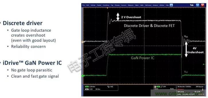 沒有柵極阻抗或電阻的分立解決方案會產生不穩定的電路。 如果添加了阻抗,它會變得穩定,但也會導致很長的開關周期。 因此,如果可以直接連接驅動器輸出和柵極輸入,那么就可以快速運行并保持穩定。壓擺率只需要一個電阻即可搞定。 因此,集成意味著一種非常可控的高性能器件。