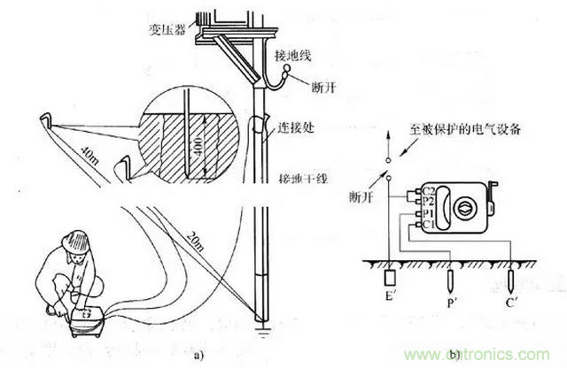 接地電阻測試使用圖解:a)實際操作 b)等效原理