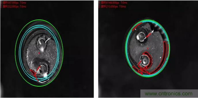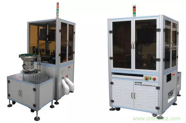 該產品方案采用頂部正光檢測(需要檢測兩個部位)、底部正光檢測和側面背光檢測三種檢測方式,采用4個工業相機,根據樣件送料速度,每分鐘可檢測100-200件產品,可代替2-6個人力檢測。