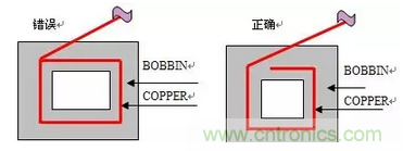 1)銅箔繞法除焊點處必須壓平外銅箔之起繞邊應避免壓在骨架轉角處,須自骨架的中央處起繞,以防止第二層銅箔與第一層間因擠壓刺破膠布而形成短路,如圖11所示。