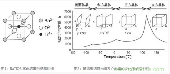 BaTiO3系陶瓷電容器加熱到居里點(diǎn)以上時(shí),結(jié)晶構(gòu)造由正方晶系轉(zhuǎn)變成立方晶系。冷卻到居里點(diǎn)溫度以下時(shí),結(jié)晶構(gòu)造由立方晶系轉(zhuǎn)變成正方晶系。(圖2)