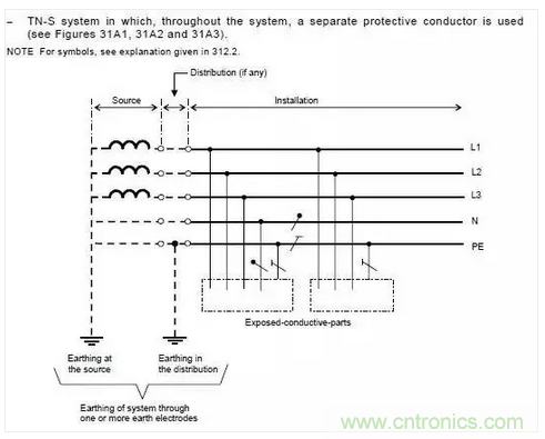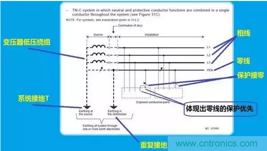 知曉這幾個概念后,我們來看看IEC給出的有關(guān)TN-C和TT系統(tǒng)的原圖。注意,這兩幅圖是不容置疑的,是有關(guān)接地系統(tǒng)的權(quán)威解釋。