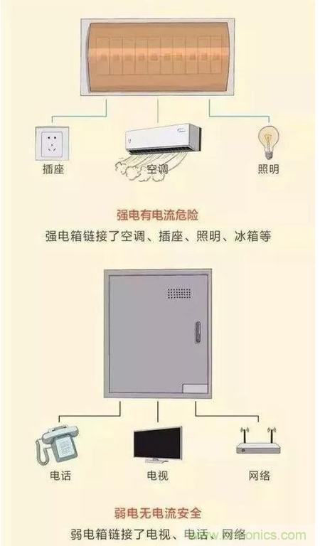 其中的強電是存在電流危險的,主要包括有空調(diào)、插座、照明、冰箱等;而弱電是沒有電流安全的,涵蓋了電視、電話、網(wǎng)絡。