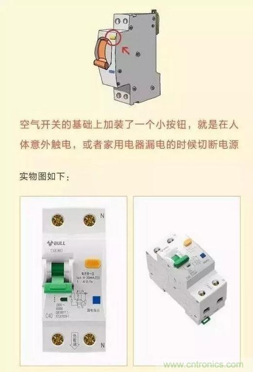 漏電斷路器是在空氣開關(guān)的基礎(chǔ)上添加的一個小按鈕,當發(fā)生意外漏電的時候,會引發(fā)開關(guān)自動切斷電源。