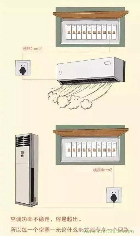 家裝中的空調(diào)一般都是單獨的線路,因為空調(diào)功率經(jīng)常不穩(wěn)定,容易出現(xiàn)超載的可能,因此每個可調(diào)都配有一個回路。