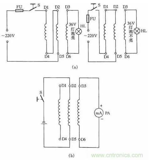 如圖26(b)所示,當開關S閉合瞬間,如表針擺向大于零,則說明電池負極所接的線端與萬用表正極表筆所接的線端是同極性的(均可認為是頭)。依此類推,便可測出另外兩相的頭和尾。