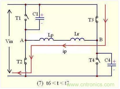 在t5-t6的時間內,副邊的二極管D1,D2還是同時導通流過電流,將副邊繞組短路,阻斷輸出電感反射到初級的途徑,此時的負載電流還是由次級電感與輸出電容提供;同時,由于原邊的T2,T3已經導通,原邊電流ip流過T3--Lr--T2,又因為Lr很小,所以原邊電流ip就會反向急劇增大。