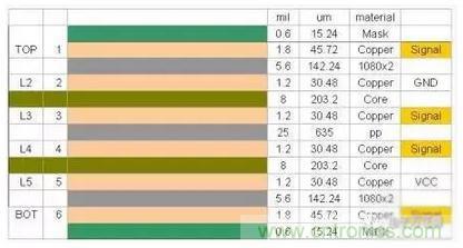 當(dāng)制作某一特定厚度的印制板時(shí),一方面要求合理地選擇各種材料的參數(shù),另一方面,半固化片最終成型厚度也會(huì)比初始厚度小一些。下面是一個(gè)典型的6層板疊層結(jié)構(gòu):