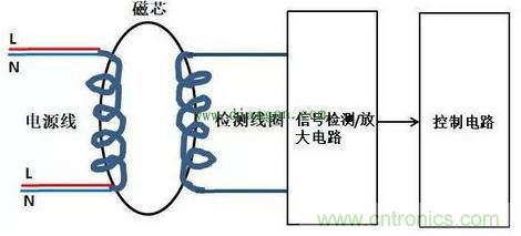 如圖1所示,漏電保護器正常工作時,因未漏電,故只有零線和火線有電流流動,即i1不存在,i0=i2,通過圖2分析得知,由于零線和火線電流大小相等,方向相反磁場相互抵消,故磁芯不生產耦合磁場,圖4的檢測線圈不生產感應電勢,控制電路不動作;當有漏電發送時,i1電流存在,火線電流i0=i1+i2,零線電流為i2,火線電流大于零線電流,不對稱,故磁芯有耦合磁場傳遞到檢測線圈那,檢測線圈產生感應電勢,導致控制電路動作切斷電源。