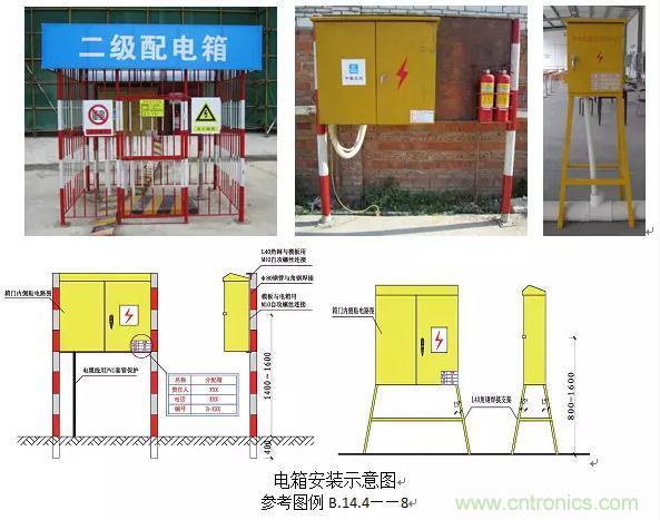 3、配電箱、開關(guān)箱應(yīng)裝設(shè)端正、牢固;固定式配電箱、開關(guān)箱的中心點與地面的垂直距離應(yīng)為1.4~1.6m;移動式配電箱、開關(guān)箱應(yīng)裝設(shè)在堅固的支架上,其中心點與地面的垂直距離宜為0.8~1.6m。(JGJ46-2005第8.1.8條)