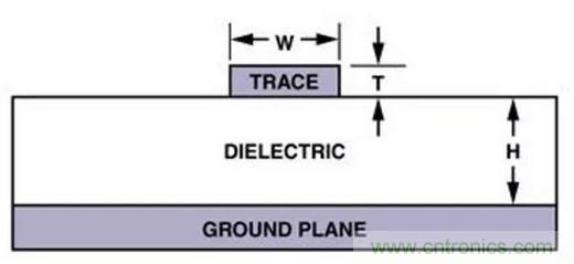 微帶控制阻抗印制線,如(圖十三)所示,可以用在PCB的任意一面;它直接採用其下面的接地平面作為其參考平面。