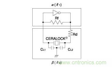 考畢茲電路采用反相放大器 (theta1=180°),還采用反饋電路中的“L”和“C”來進行進一步反轉 (theta2=180°)。當振蕩電路采用CERALOCK®時,其工作原理同上。為了在考畢茲振蕩電路中利用CERALOCK®,通常使用逆變器。