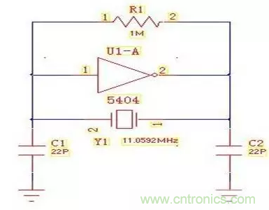 Y1是晶體,相當于三點式里面的電感,C1和C2就是電容,5404非門和R1實現一個NPN的三極管,接下來分析一下這個電路。