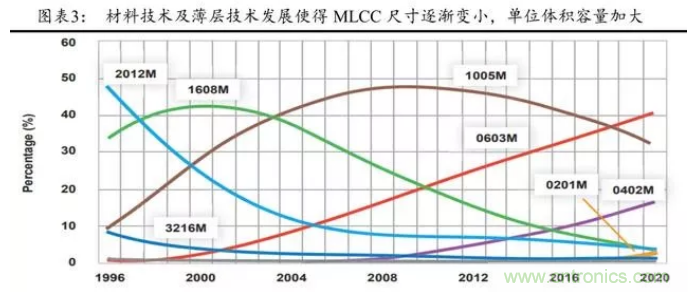 MLCC小型化、大容量、高壓化及高頻化是大趨勢。MLCC作為新興電容器,誕生于 1960s 的美國,但當其流傳到日本,才得到大規模的發展。