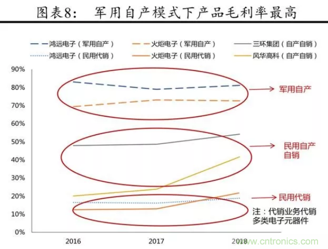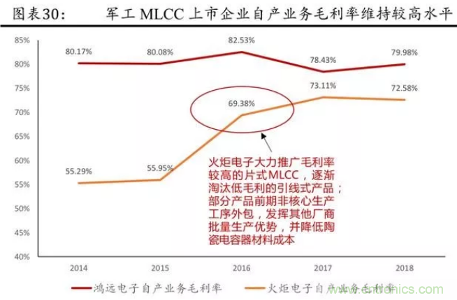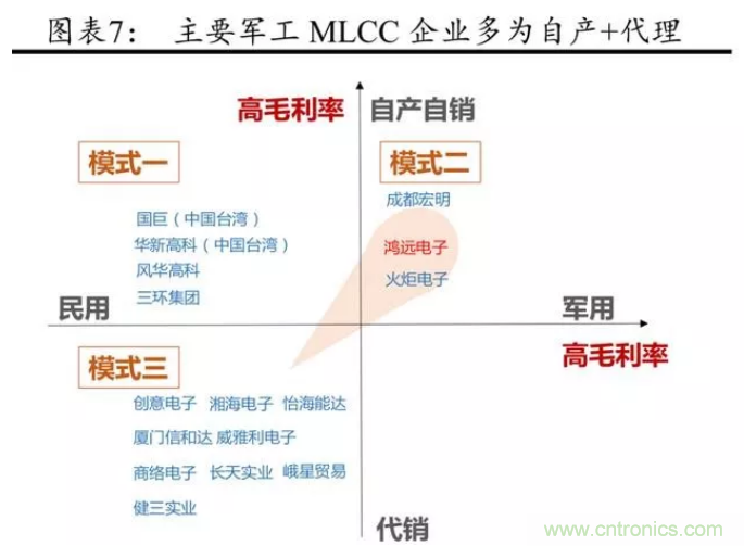 自產自銷模式中,在軍用領域,MLCC 因主要采用定制供應商目錄的管理模式,且需要獲得一系列嚴格的資質審查,且軍用高可靠 MLCC 對產品性能、可靠性及供貨穩定性有著更高或更特殊的要求等,具有較高的市場壁壘,毛利率水平一般可以達到 70%~80%,代表廠商有鴻遠電子、火炬電子等,顯著高于民品。