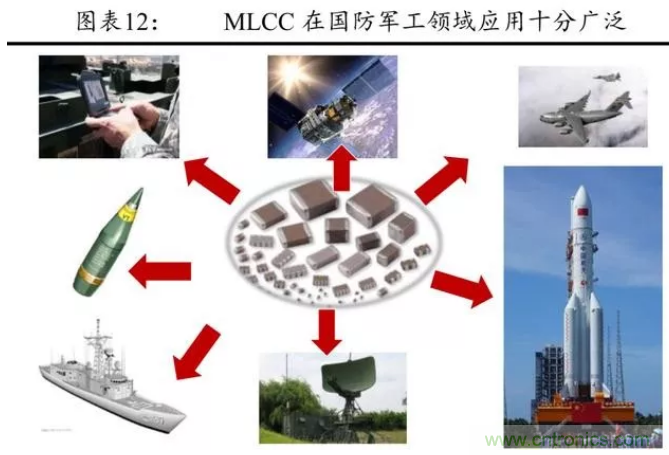 MLCC 具有體積小、成本低、單位體積電容量大及溫度等環境對性能影響小等特點, 在航空電子設備、裝甲車輛電子設備、軍用移動通訊設備、武器精確制導及軍事信號監控等軍用電子設備上的用途越來越廣。