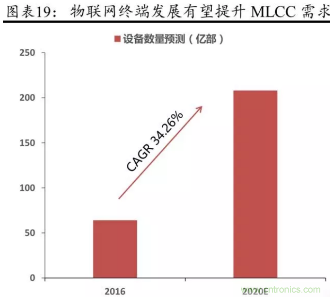 新能源車滲透率方面,一輛電動汽車所需 MLCC 是目前普通內燃機的6倍。據工信部,我國新能源汽車要爭取 2019 年 8%、2020 年 10%的滲透率。