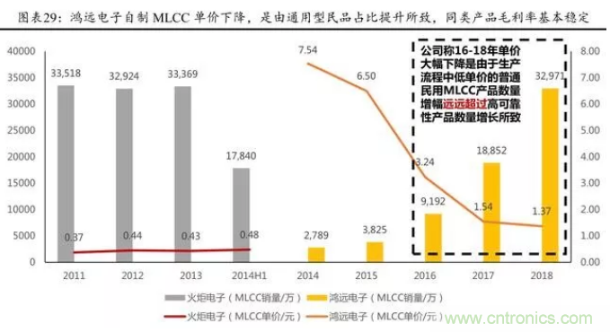 從各企業生產 MLCC 價值量看,2014H1 火炬電子生產陶瓷電容 器平均單價為 0.46 元, 而鴻遠電子 2014 年MLCC平均單價為 7.54 元,近幾年呈現下降趨勢, 我們判斷,整體主要是因為自制部分通用型民品的數量占比略有提升。
