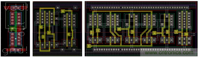 對于標(biāo)準(zhǔn)單元的版圖,根據(jù)工藝要求,標(biāo)準(zhǔn)邏輯單元的高度是固定的,寬度為最小單元寬度的公約數(shù)倍數(shù),例如在圖3中,左圖為反向器(inverter,INV)的版圖,中圖為選擇器(multiplexer,MUX)的版圖,右圖為D型寄存器的(D-Flip Flop, DFF)的版圖。如上所述,從版圖設(shè)計(jì)中,可以導(dǎo)出并建立GDSII和LEF文件。GDSII文件經(jīng)過設(shè)計(jì)簽核(design sign-off)過程由代工廠使用于芯片制造,LEF文件用于全芯片的P&R物理設(shè)計(jì)。