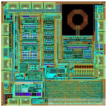 射頻無線模塊或者獨(dú)立的射頻芯片,從電路設(shè)計(jì)到版圖設(shè)計(jì),完全屬于全定制設(shè)計(jì)方式。設(shè)計(jì)人員在標(biāo)準(zhǔn)版圖設(shè)計(jì)和半定制版圖設(shè)計(jì)的基礎(chǔ)上,不斷開發(fā)出專用的芯片射頻產(chǎn)品。圖6為某射頻公司自行設(shè)計(jì)的5GHz通信產(chǎn)品全定制版圖案例,即版圖為全手工設(shè)計(jì),芯片制造采用180nm射頻工藝,其數(shù)據(jù)率達(dá)到5Gbps。