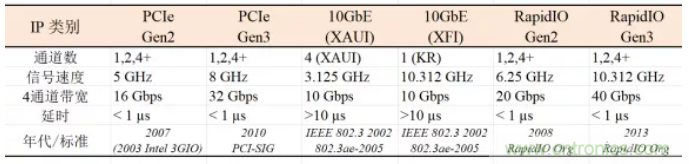 物聯(lián)網(wǎng)和5G聯(lián)網(wǎng)通信中除了信號收發(fā)單元(transceiver, TRX 以及TX/RX)設(shè)計(jì)芯片之外,離不開專用的系統(tǒng)芯片SoC,其中高性能與高速核心IP往往決定了SoC的性能和速度。常見的高性能與高速核心IP有: PCIe, 10 Gigabit Ethernet (10 GbE), RapidIO, SerDes, USB等。表1列出了幾種物聯(lián)網(wǎng)和5G時代常用的高性能與高速IP的信號速度和數(shù)據(jù)率。