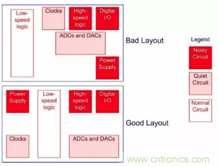 第一個布局中放置時鐘和數據轉換器在相鄰于噪聲器件的附近。噪聲將會耦合到敏感電路及降低他們的性能。第二個布局做了有效的電路隔離將有利于系統設計的信號完整性。