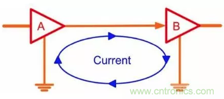 在電流環路設計中會被數字電路設計者忽視的因素,包括對單端信號在兩個門電路間傳送的考慮(圖2)。從門 A 流向門 B 的電流環路,然后再從地平面返回到門 A。