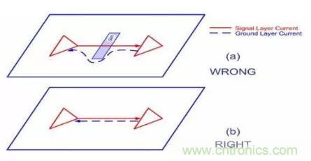 在 PCB 設計中一個常見的錯誤是在層間打過孔和開槽。圖3顯示了當一條信號線在一個開過槽的不同層上的電流流向。回路電流將被迫繞過開槽,這就必然會產生一個大的環流回路。