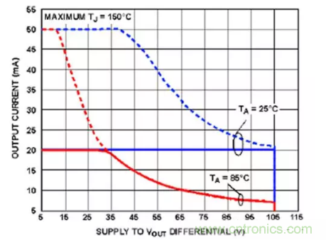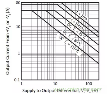 圖8:研究安全工作區域 (SOA) 曲線圖至關重要。ADHV4702-1的DC SOA由曲線下方的區域表示,曲線對應的環境溫度分別為25°C和85°C,增益為20V,供電電壓為±110伏。(圖片來源:Analog Devices)