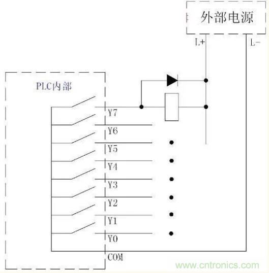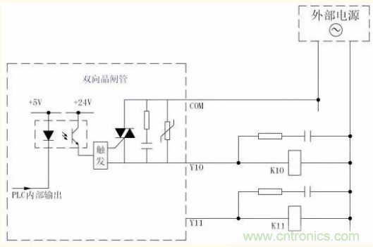 這是PLC輸出電路常見(jiàn)的一種形式,其電路形式如下圖所示。該種輸出電路形式外接電源既可以是直流,也可以是交流。