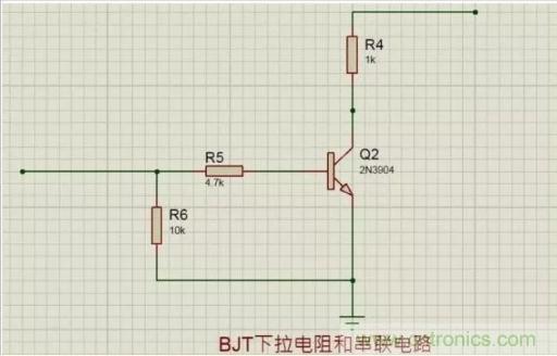 在BJT晶體三極管的基極端,上拉電阻和下拉電阻也起著至關重要的作用。在三極管的電路應用中,串接在基極上的電阻起限制基級電流的作用,如下圖中的R2所示,