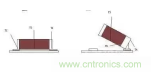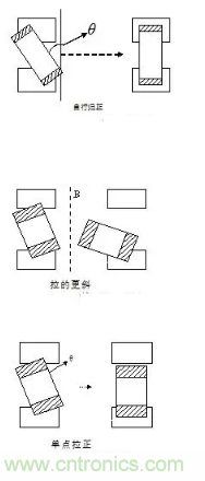 當(dāng)貼片時,由于焊墊的不平或焊膏的滑動,造成片感偏移了θ角。由于焊墊熔融時產(chǎn)生的潤濕力,可能形成以上三種情況,其中自行歸正為主,但有時會出現(xiàn)拉的更斜,或者單點拉正的情況,片感被拉到一個焊盤上,甚至被拉起來,斜立或直立(立碑現(xiàn)象)。目前帶θ角偏移視覺檢測的貼片機(jī)可減少此類失效的發(fā)生。