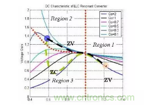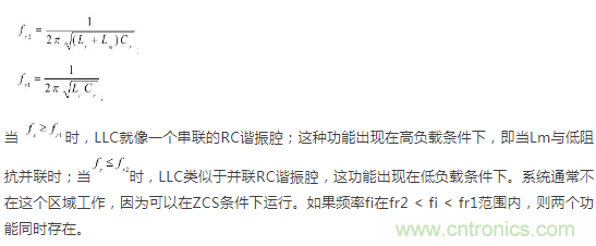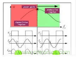 分析一下諧振頻率的方程式就會發現,在高于峰值增益頻率時,諧振網絡的輸入阻抗是感抗,諧振網絡的輸入電流(Ip)滯后于諧振網絡的輸入電壓(Vd)。在低于峰值增益頻率時,諧振網絡的輸入阻抗變為容抗,并且Ip領先Vd。在電容區工作時,體二極管在MOSFET開關期間執行反向恢復操作。