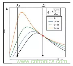 如果使用圖形表示諧振單元的增益,我們就得到圖3所示的曲線,不難看出,圖形變化與Q值相關。
